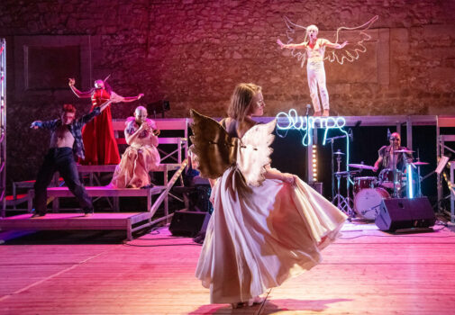 Grand Siècle accueille les spectateurs sur le lieu de représentation et sert d’introduction et d’intermèdes aux trois spectacles proposés, le tout, un verre à la main…