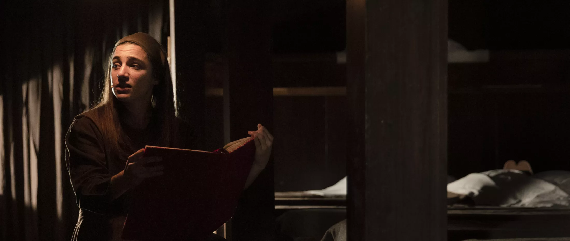 Dans le clair-obscur d’une pièce tapissée d’écorces, la narratrice accueille les enfants mais aussi celles et ceux qui ne peuvent pas s’endormir sans qu’on leur lise une histoire. Chacun·e s’installe dans son lit, lové dans le noir de la nuit et remonte sa couverture. Alors que la douce voix de la conteuse entame l’histoire du Petit Poucet, nous nous laissons émerveiller par le bruissement de la forêt profonde. Le frottement des feuilles, les cailloux que l’on sème et les pas terrifiants de l’ogre jaillissent pour nous happer jusqu’aux limites du langage, là où la parole se mêle aux sonorités animales et fantastiques. On ne voit rien, mais on entend tout : deux bruiteurs, invisibles, s’affairent à l’extérieur du dortoir et bâtissent cette architecture sonore, en live.