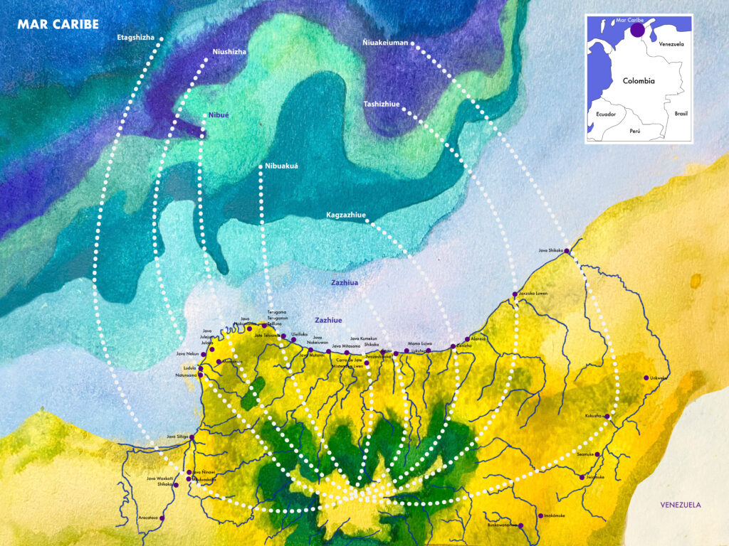 La ligne noire est un fil spirituel et invisible autour et à l’intérieur de la Sierra Nevada de Santa Marta qui délimite un continuum d’espaces sacrés. Ils sont reliés entre eux tant à l’intérieur du territoire ancestral que vers l’espace extérieur environnant, y compris la mer.